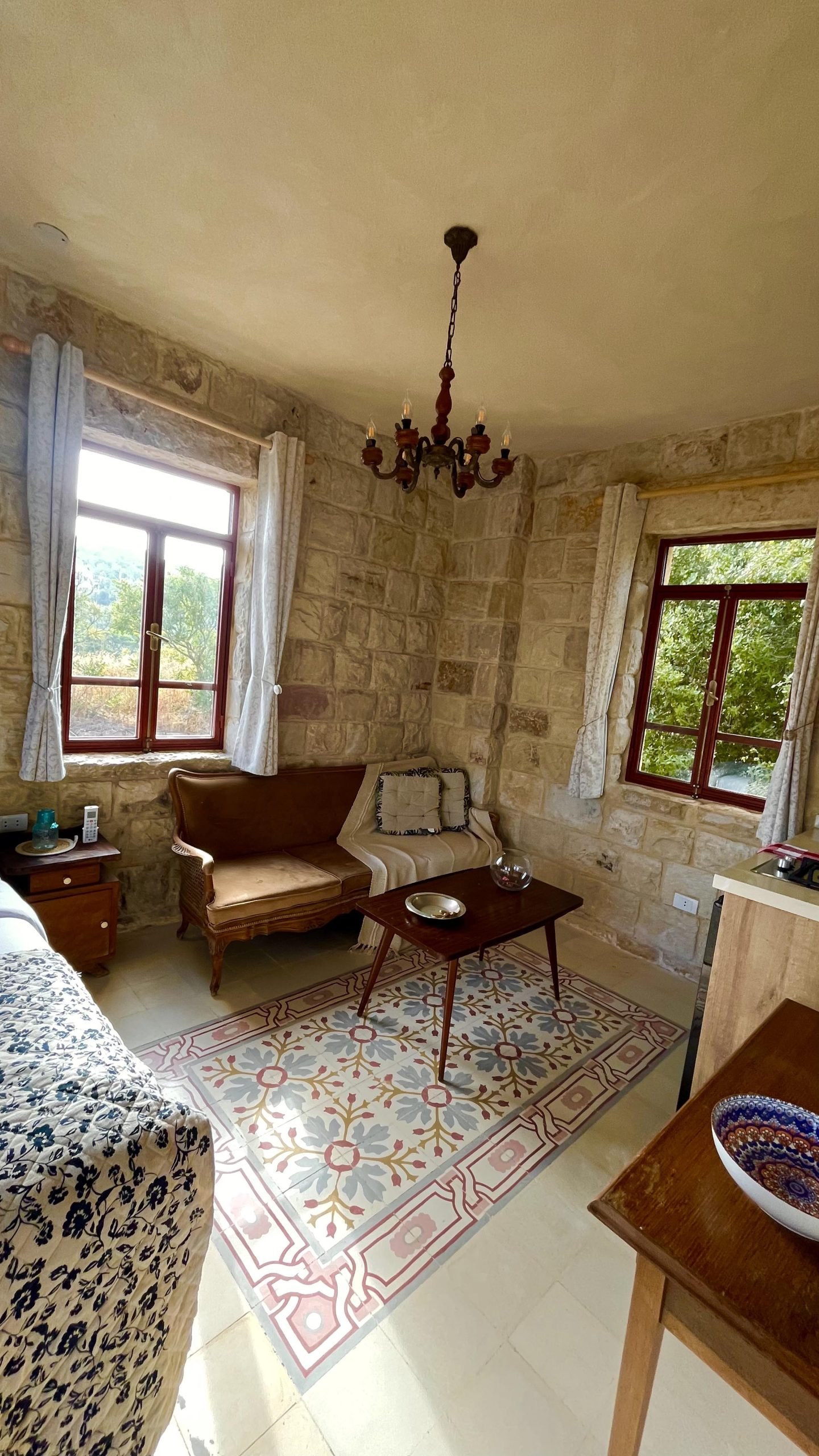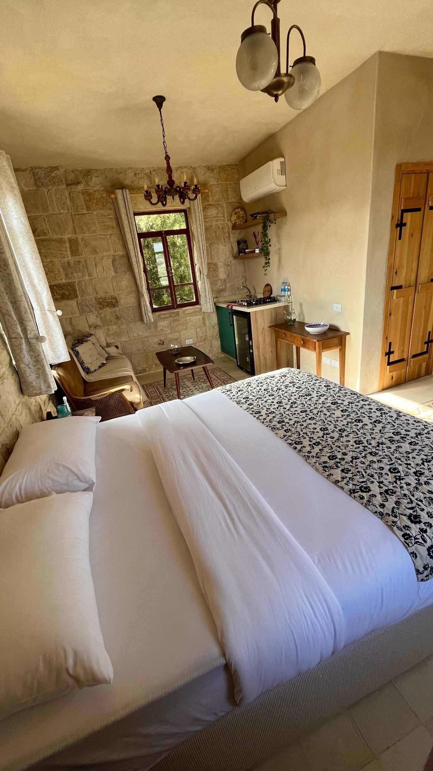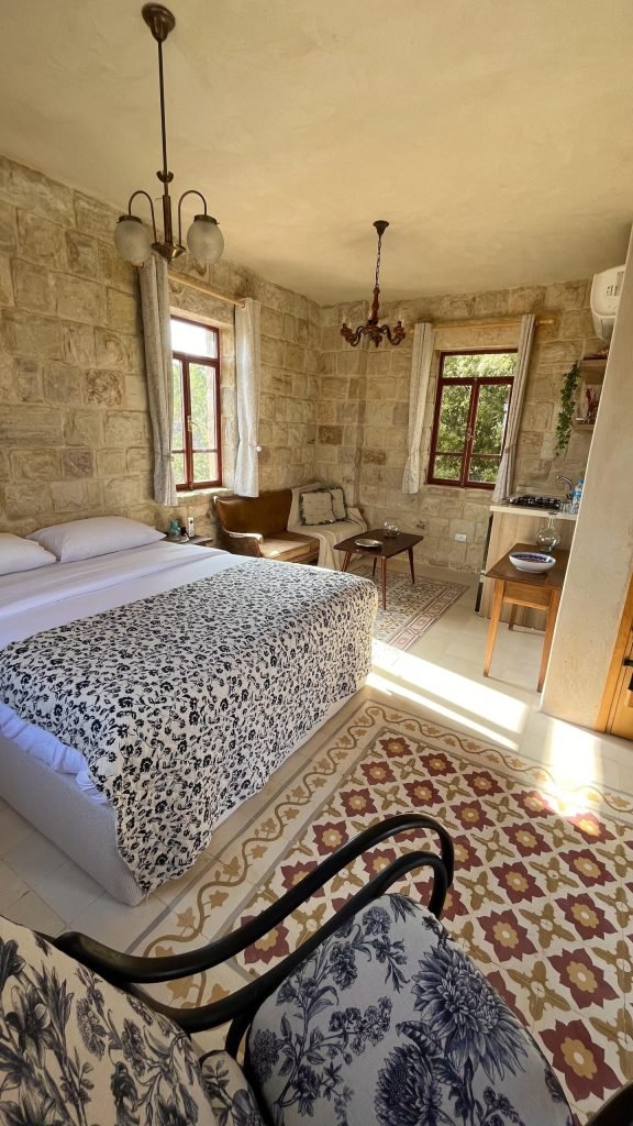 A tribute to timeless grace, Beit al Sitt is where elegance meets heritage. Tucked within the stone walls of Qasr Tabet, this intimate guesthouse features a charming master bedroom, a traditional-style kitchen, and a warm sitting area—ideal for serene mornings and quiet afternoons. Adorned with handpicked vintage pieces, embroidered linens, and sunlit windows overlooking the Shouf hills, Beit al Sitt evokes the refined spirit of the noble women who once hosted with grace and generosity.