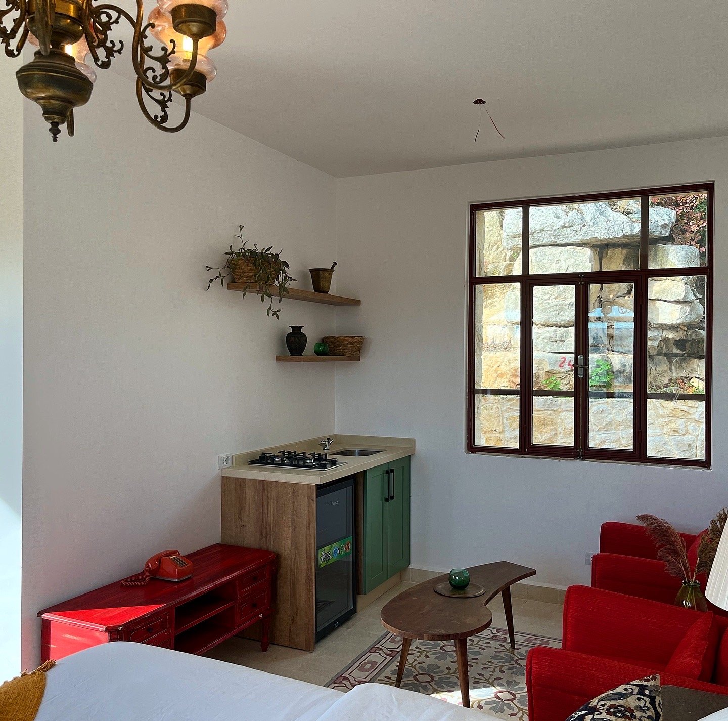 Experience the perfect blend of luxury and rustic charm in the Malek Suite Room! This enchanting suite boasts a spacious master bedroom and a fully equipped kitchen that seamlessly connects to a cozy sitting area. Designed with your comfort in mind, the Malek Suite accommodates 1 or 2 guests, making it an ideal getaway for couples or solo travelers seeking tranquility.