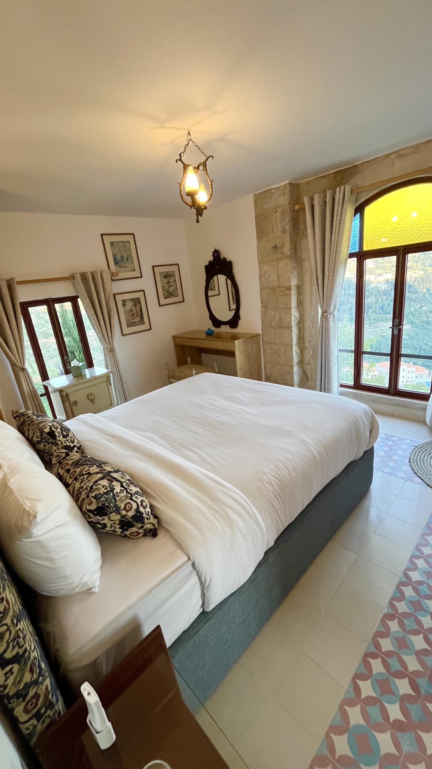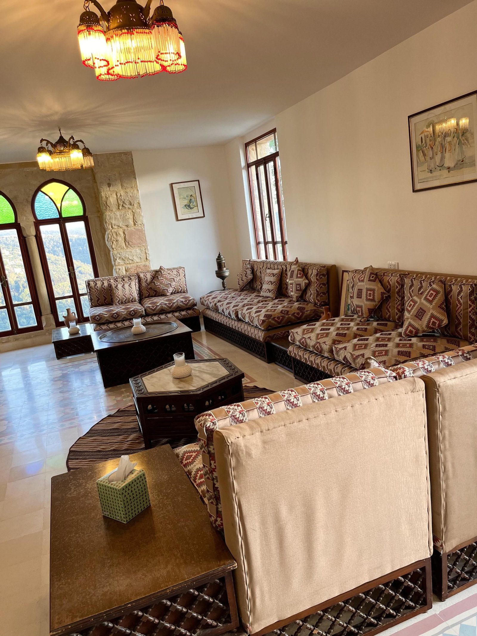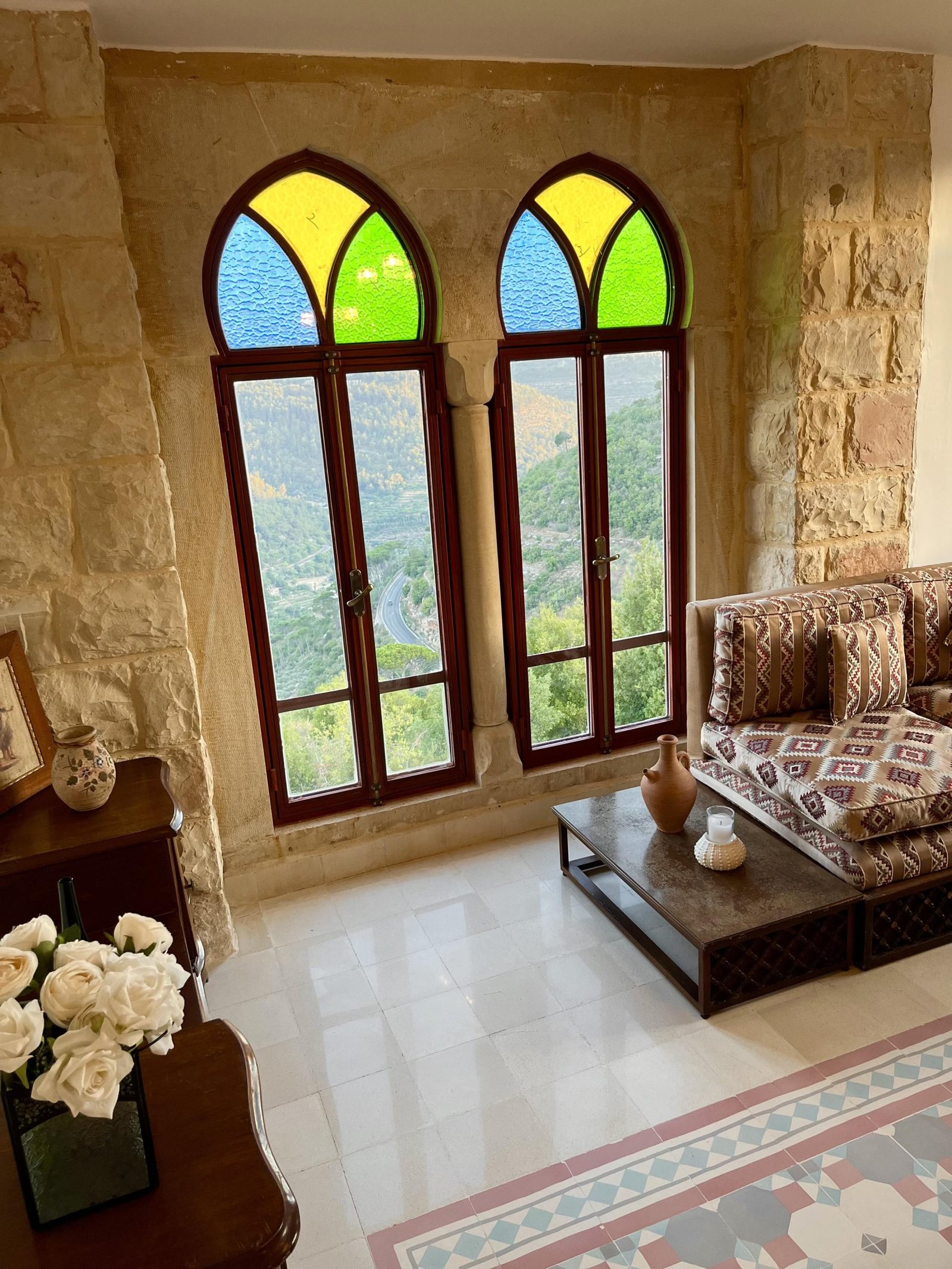 Mandaloun House is a spacious haven with two serene master bedrooms, a fully equipped kitchen, and an inviting majlis-style sitting area that opens to panoramic views of the Shouf hills. Rich in heritage and charm, the house features handcrafted stonework, colorful stained glass, and vintage-inspired furniture that celebrate Lebanon’s timeless architectural beauty. Whether you're gathering with family or simply savoring stillness, Mandaloun House offers warmth, space, and cultural authenticity.
