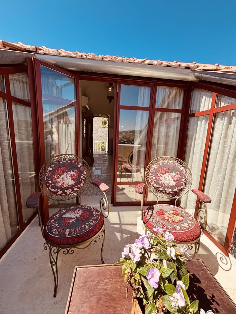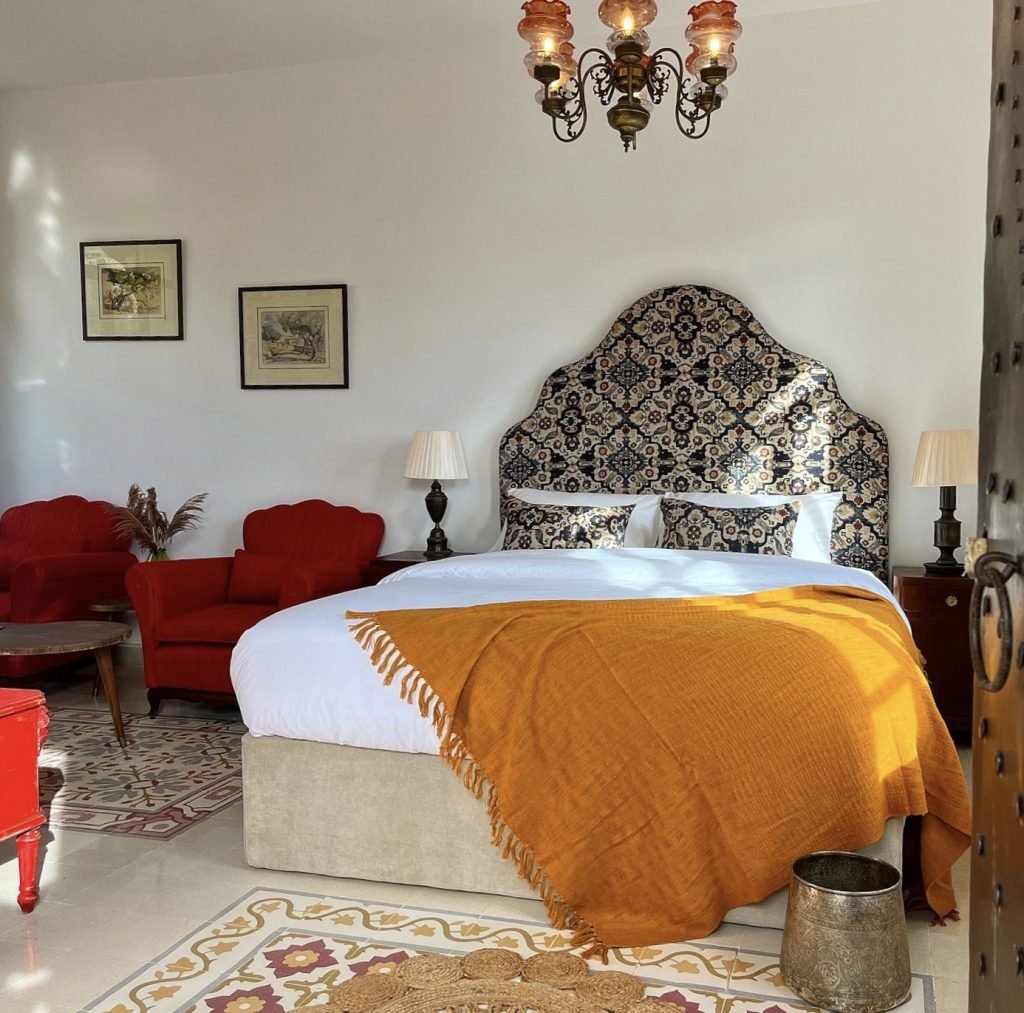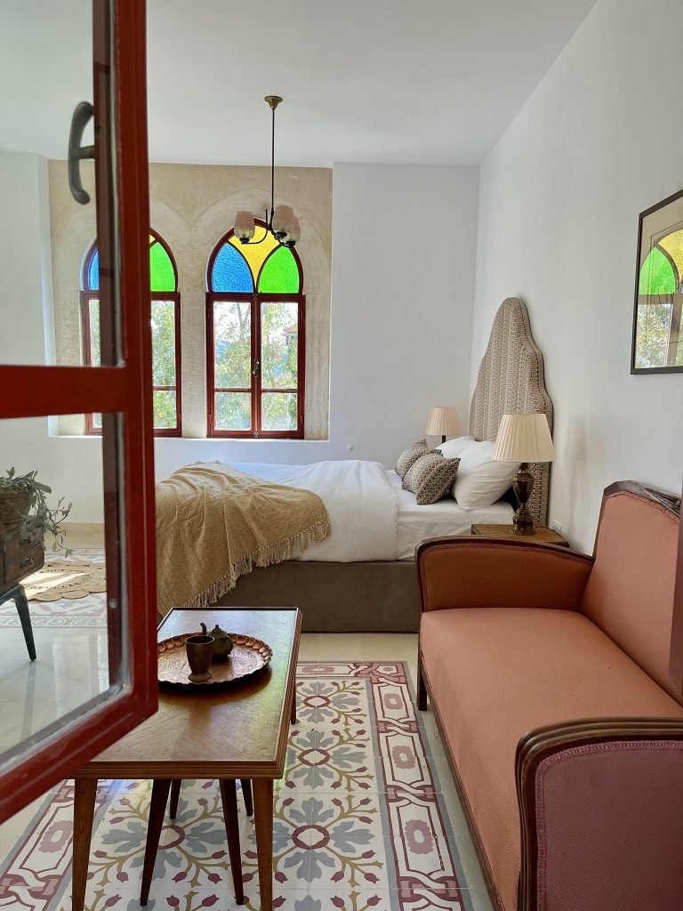 A bright and stylish retreat, the Saray Suite brings a touch of vintage Lebanese elegance to your stay at Qasr Tabet. Inspired by the refined charm of old Levantine palaces Saray, this suite blends tradition and simplicity with vibrant character. It features a spacious master bedroom, a cozy sitting area adorned with retro green furnishings, and a fully equipped kitchenette. The patterned tiles, classic chandelier, and warm wood accents create a cheerful yet nostalgic atmosphere, perfect for couples or solo travelers seeking both comfort and authenticity.