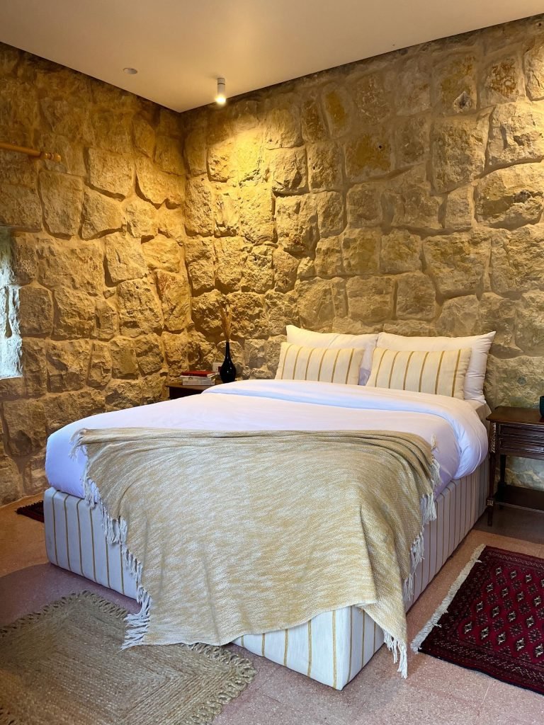 Jnan Suite is a peaceful retreat nestled within Qasr Tabet’s historic stone walls. Designed to reflect the timeless charm of traditional Lebanese homes, this suite blends rustic beauty with soft modern comfort. With a serene master bedroom, cozy sitting area, and a fully equipped kitchen, Jnan offers a space to unwind, reflect, and reconnect, with nature, with heritage, and with yourself. Warm textures, handcrafted touches, and sunlight streaming through the small traditional window bring a sense of quiet luxury.